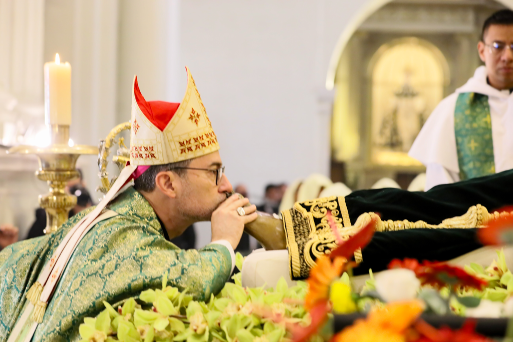 Su Excelencia Reverendísima Monseñor Tulio Omar Pérez Rivera, Obispo Auxiliar de la Arquidiócesis de Santiago de Guatemala, antes de revestirse como pastor del pueblo, no pudo evitar santiguarse y elevar una oración silenciosa ante aquella imagen del Señor Sepultado, en un encuentro íntimo entre el alma sacerdotal y el Cristo dormido en su gloria.