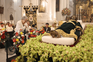 A las cinco de la mañana, en un divino vaivén, el Señor del Viernes Santo, el del Santo Entierro más antiguo de América, era entronizado en su catafalco, rodeado por más de cien varas de orquídeas y otras flores que evocaban las plegarias y promesas de sus devotos.